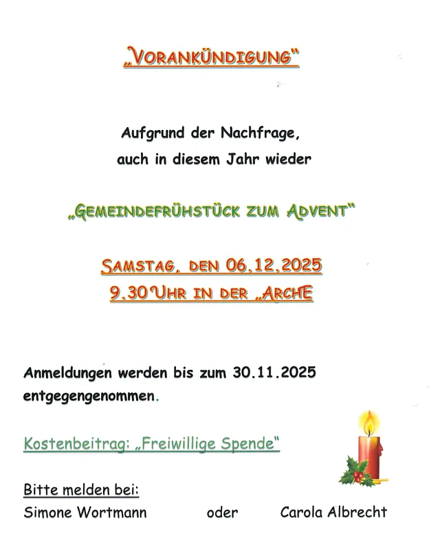 Samstag, 06. Dezember 09.30 Uhr Gemeindefrühstück