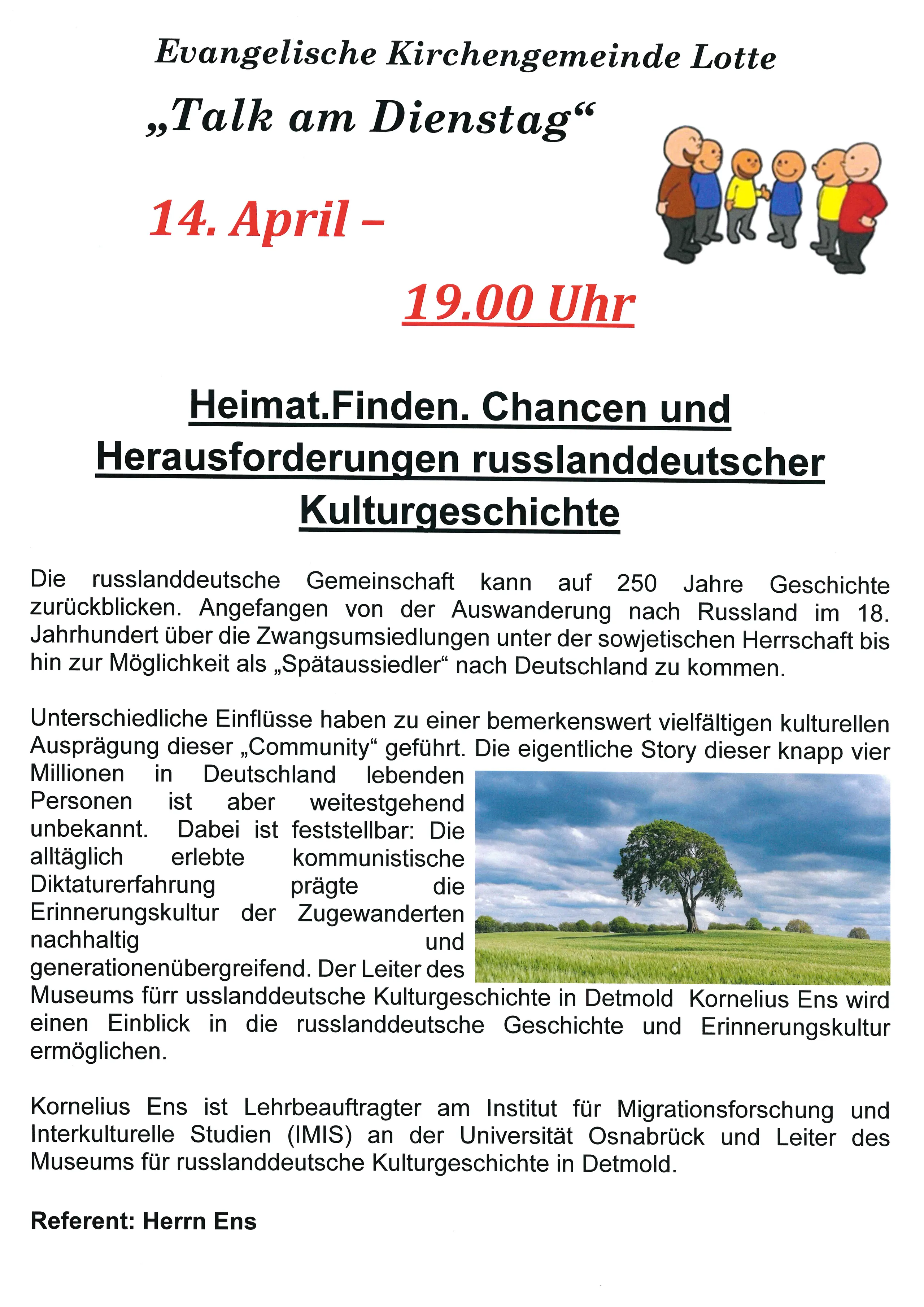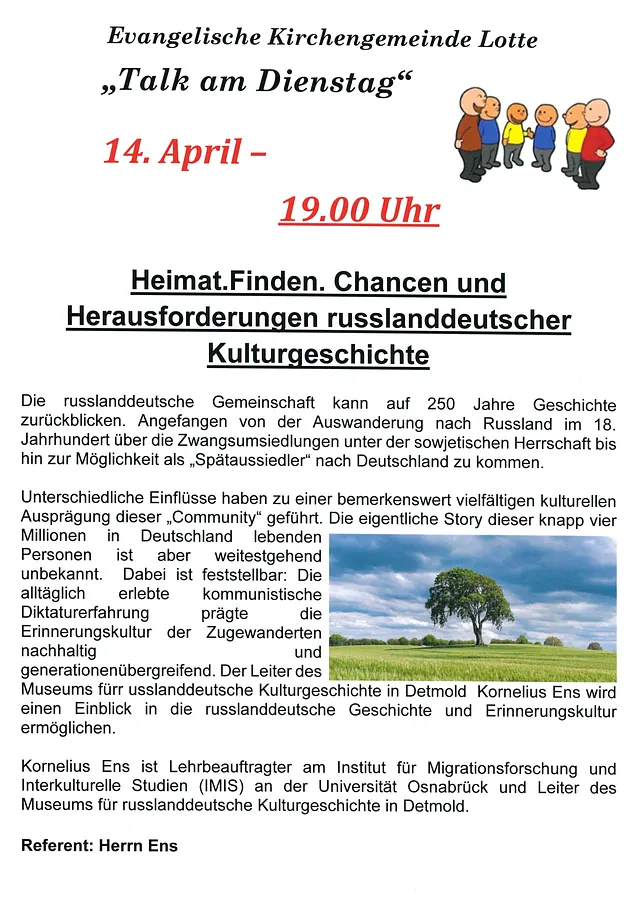 Referent: Kornelius Ens, Lehrbeauftragter am Institut für Migrationsforschung und Interkulturelle Studien an der Universität Osnabrück und Leiter des Museums für russlanddeutsche Kulturgeschichte.
